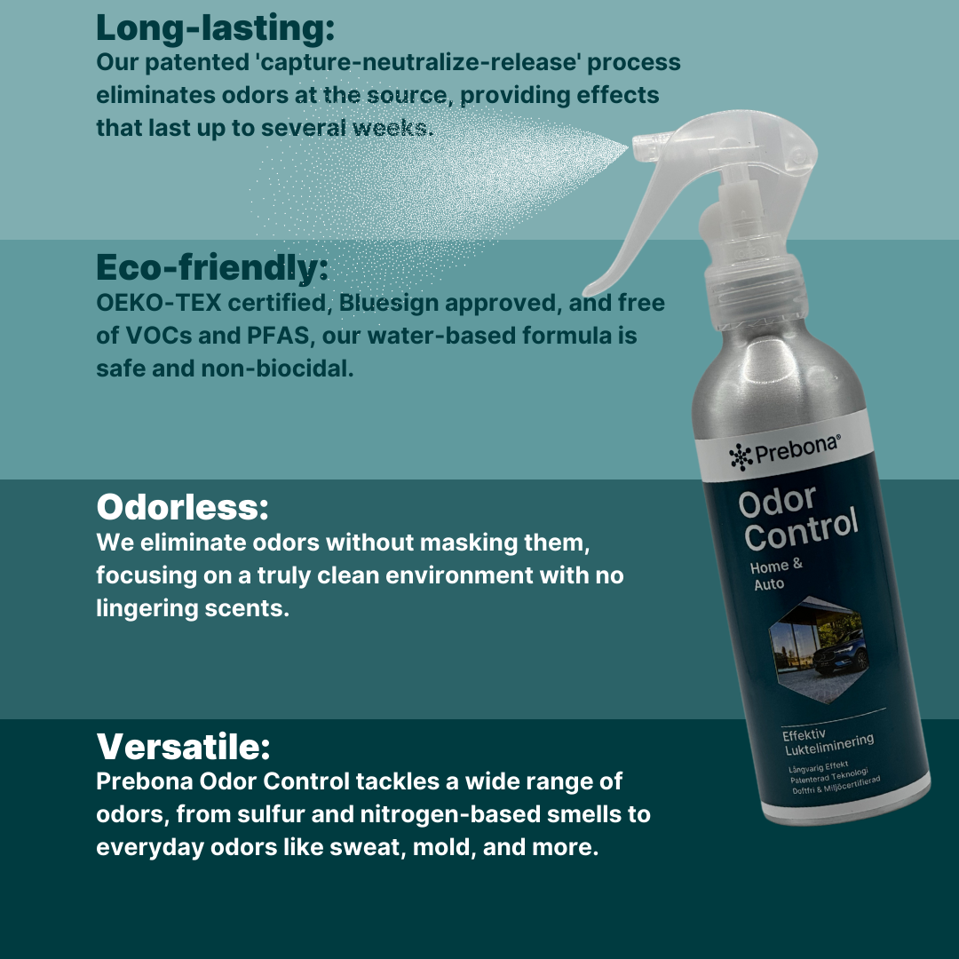 Prebona OdorControl eliminates unwanted smells from urine and pet odors to smoke and waste at the source, without the use of harmful chemicals. Our versatile, water-based solutions are easy to apply on both soft and hard surfaces – in homes, offices, healthcare settings, and more – leaving a lasting, fragrance-free freshness.